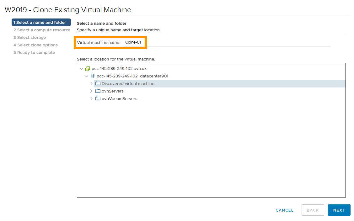 Name the clone VM and select its datacenter location.