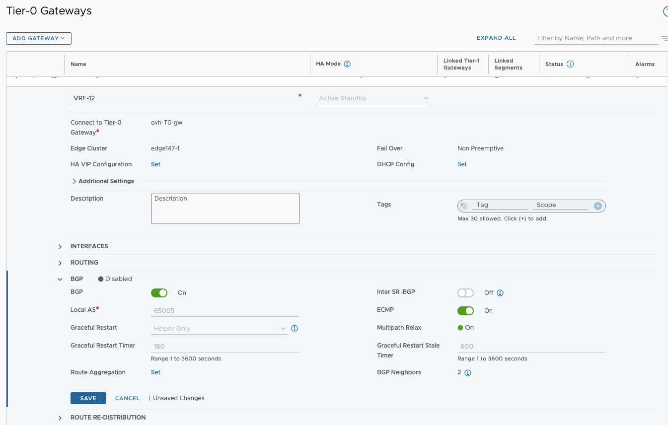 1. To create a Virtual Routing Firewall (VRF), go to Connectivity > Tier-0 Gateways > Add Gateway > VRF.