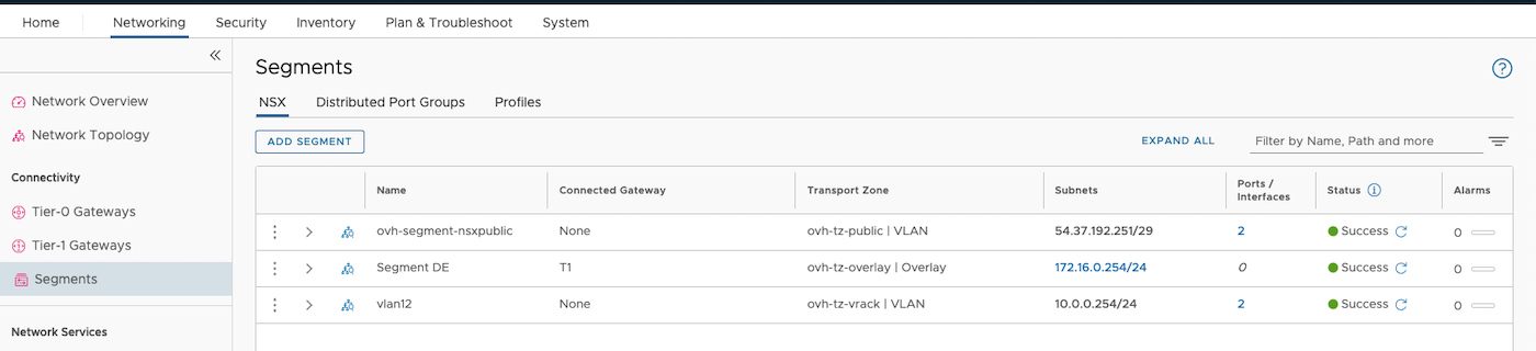 4. Verify that your two interfaces are created and that their status is in Success (section Tier-0 Gateway).