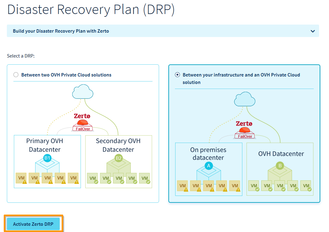 It is easy to activate Zerto features from the OVHcloud Control Panel. You just need to select the data centre linked to the Hosted Private Cloud solution that you want to use, from the Disaster Recovery Plan tab.