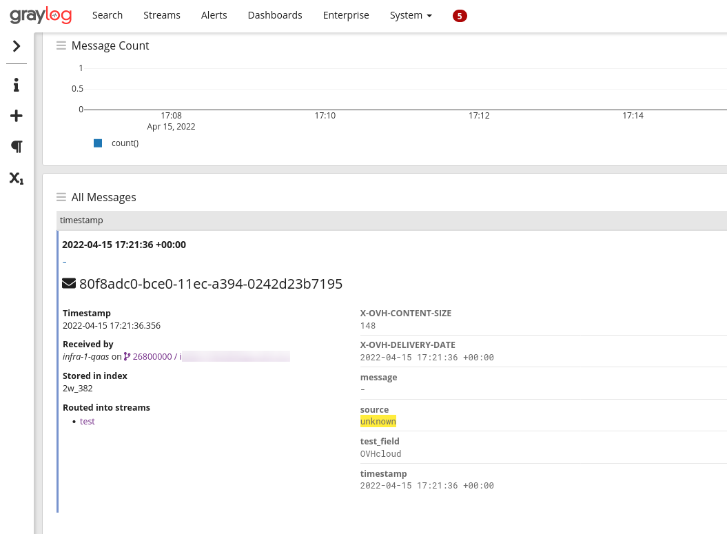 The system automatically set the timestamp at the date when the log was received and added the field test_field to the log message. Source was set to unknown and the message to -. Note that the payload follows the JSON specification (and not the GELF one). The system will still recognize any reserved field used by the GELF specification. Here is another example: