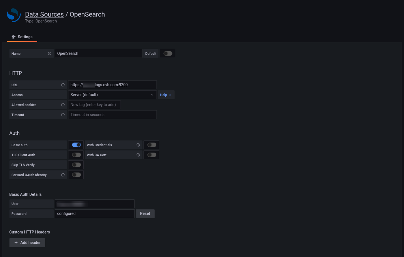 Set https://<your_cluster>.logs.ovh.com:9200 as URL value