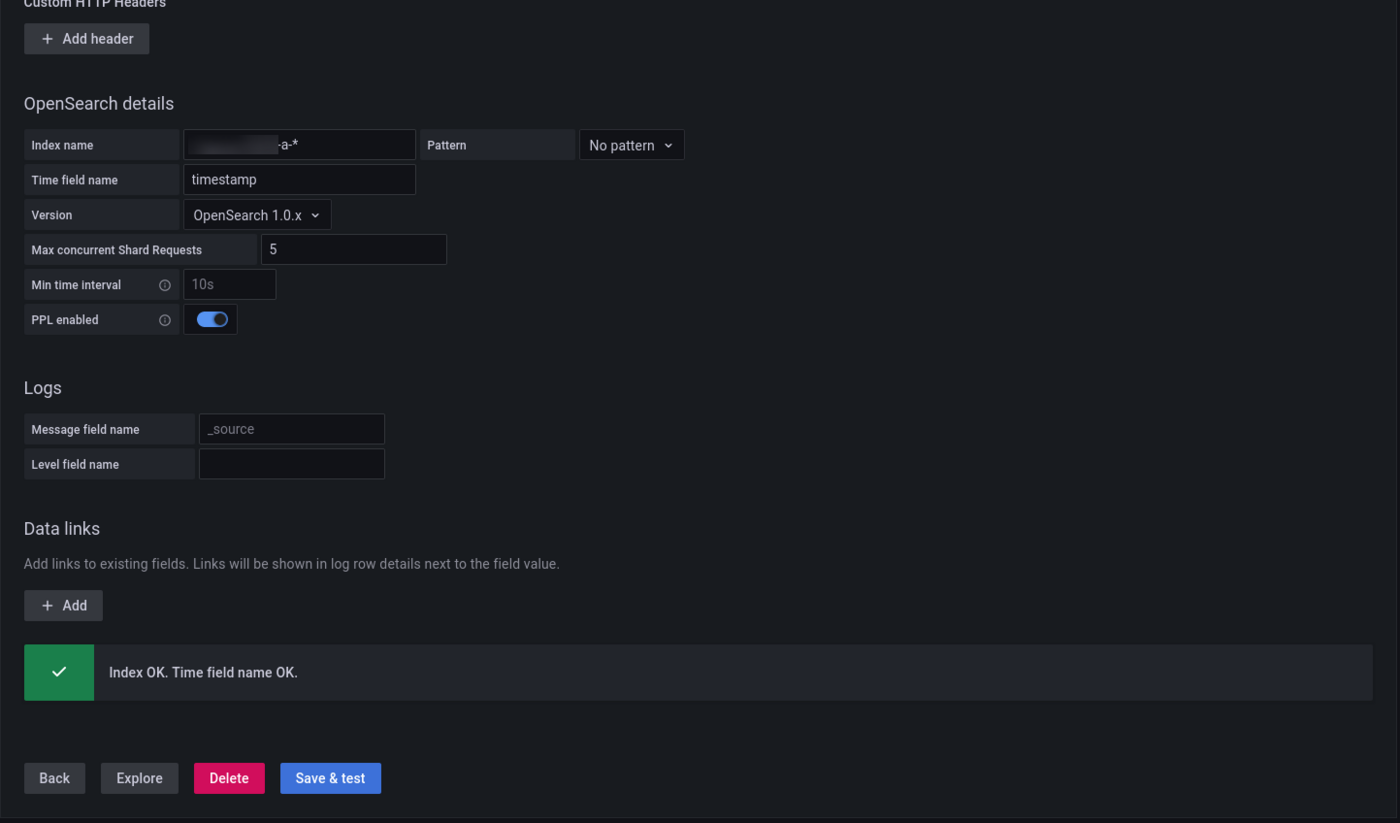 Set the Index name as the Logs Data Platform alias linked to Grafana