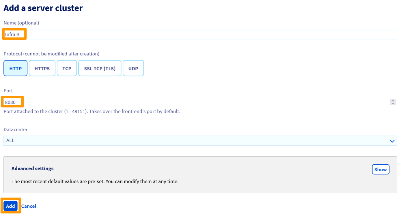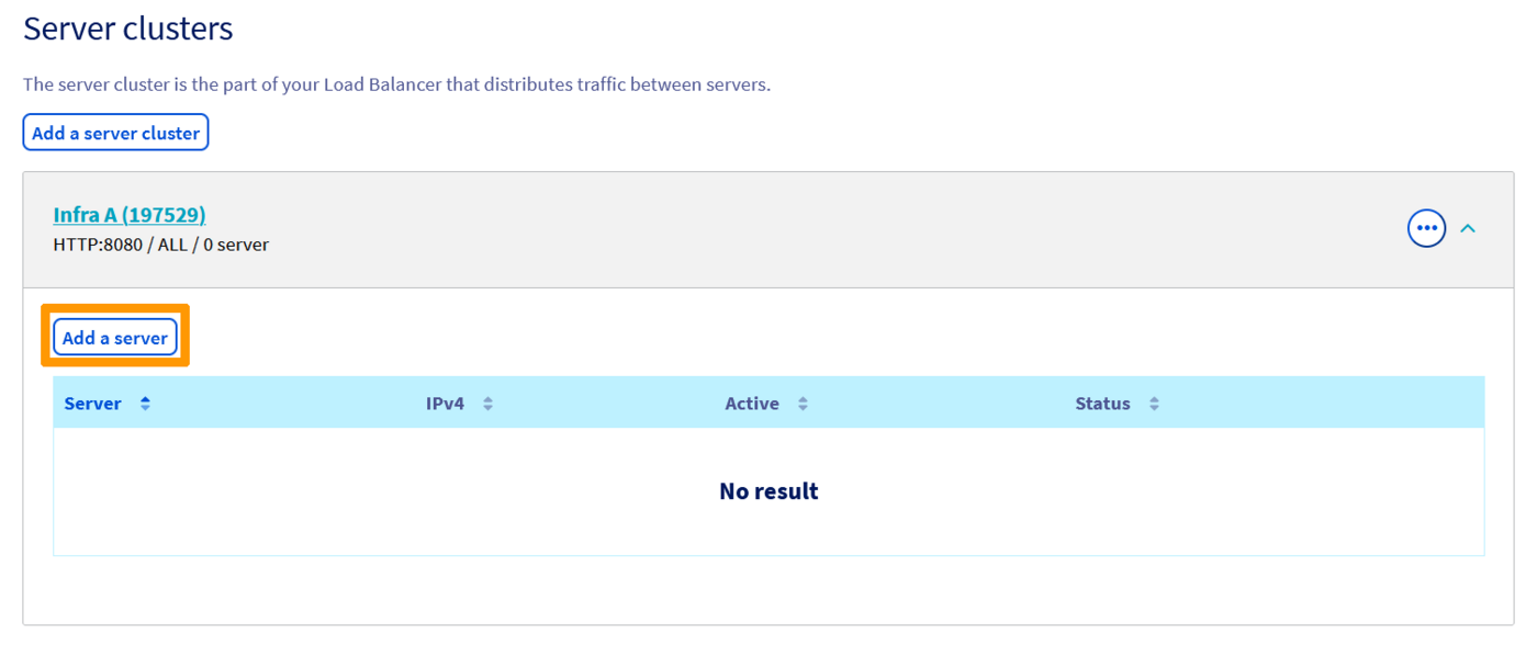 This infrastructure is made up of a server farm that will later be associated with a front-end of your Load Balancer. This farm will expose an HTTP, TCP or UDP service to the front-end. It also balances loads by sending the front-end's incoming traffic to the servers. For more details on the role of the various components of the OVHcloud Load Balancer service, please refer to the following guide: Introduction to the OVHcloud Load Balancer.