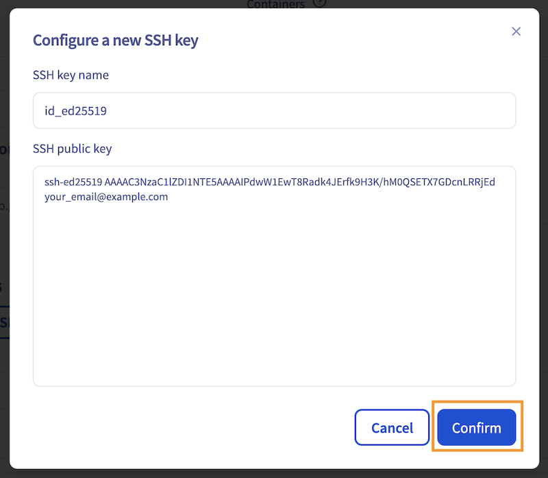 Click on Confirm. Once your key is added, you can select it from your SSH Keys list: