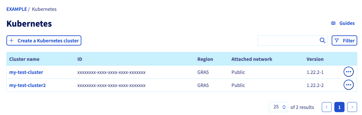 List your OVHcloud Managed Kubernetes clusters The GET /cloud/project/{serviceName}/kube API endpoint lists all the available Kubernetes clusters: