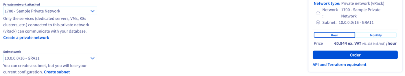 You can be forwarded to create a private network or subnet by clicking on the respective links. You will have to start the database order process anew in that case.