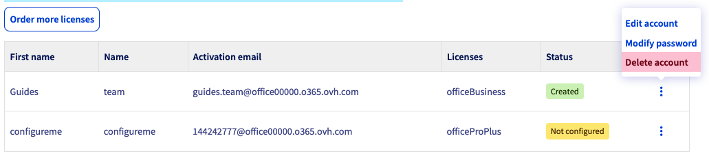Clicca sul pulsante ⁝ sulla linea della licenza per cui vuoi attivare il servizio, poi su Modifica l'account.