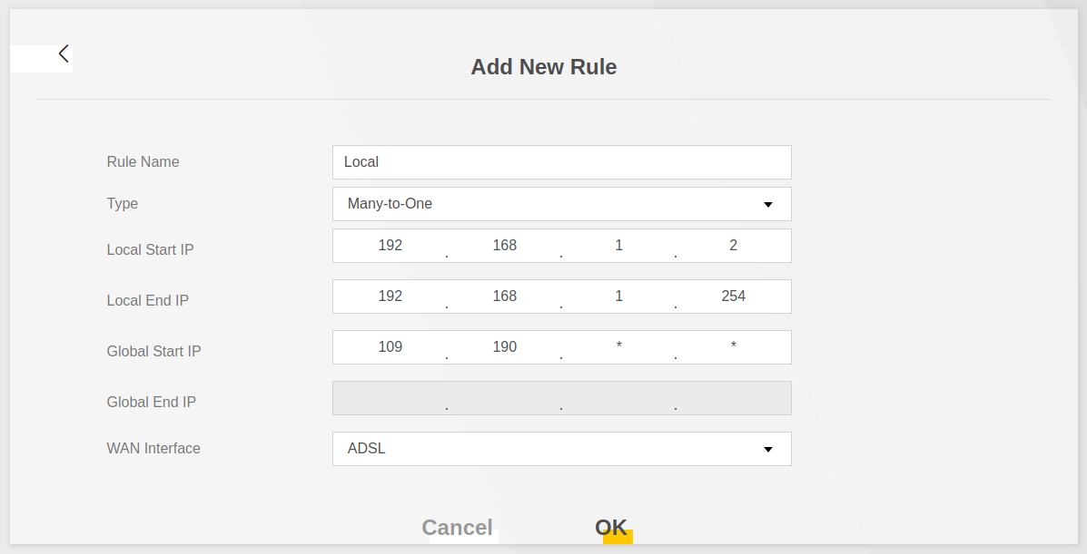 À présent, il est nécessaire de créer une règle afin d'autoriser les équipements connectés en local à accéder à Internet. Pour cela, retournez dans le menu Network Settings, puis sur NAT. Dans la nouvelle fenêtre, positionnez-vous sur l'onglet Address Mapping et cliquez sur le bouton Add New Rule.