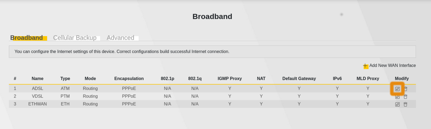 Toujours dans le menu Network Settings, sélectionnez le menu Broadband. Cliquez sur l'icône représentant une feuille et un crayon, à droite du nom de l'interface utilisée par votre modem. L'interface dépend de votre type de connexion :