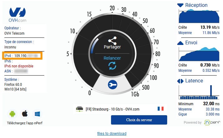 Une fois cette opération effectuée depuis un ordinateur, vous aurez la possibilité de tester l'attribution de nouvelles adresses IP en réalisant un test de débit depuis notre site http://ovh.net/. À la fin, celles-ci apparaîtront à côté de IPv4 à gauche.