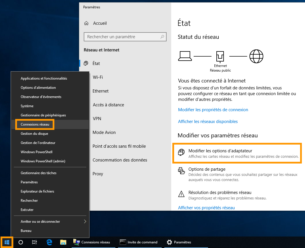 Effectuez un clic droit sur l'image en bas à gauche représentant le logo Windows et cliquez sur Connexions réseau. Dans la fenêtre qui apparaît, assurez-vous d'être bien positionné sur l'onglet État dans la barre de menu à gauche, puis cliquez sur Modifier les options d'adaptateur.