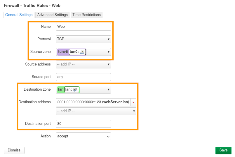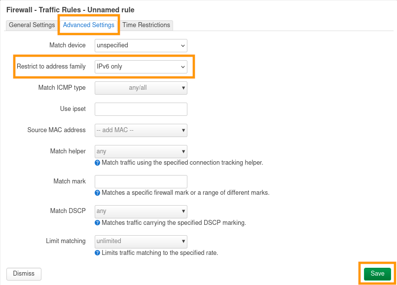 Dans le paramètre Restrict to address family, sélectionnez IPv6 only pour limiter la règle uniquement au trafic IPv6 .