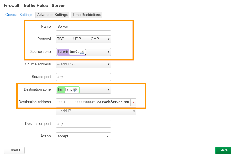 Il est possible de créer une règle de pare-feu pour autoriser l'accès sans restriction à un équipement client depuis l'extérieur. Dans cet exemple, nous allons autoriser l'accès à tous les ports du serveur webServer.lan .