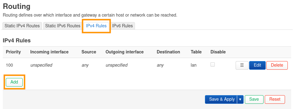 Dans l'onglet IPv4 Rules, cliquez sur le bouton Add, afin d'ajouter une règle de routage.