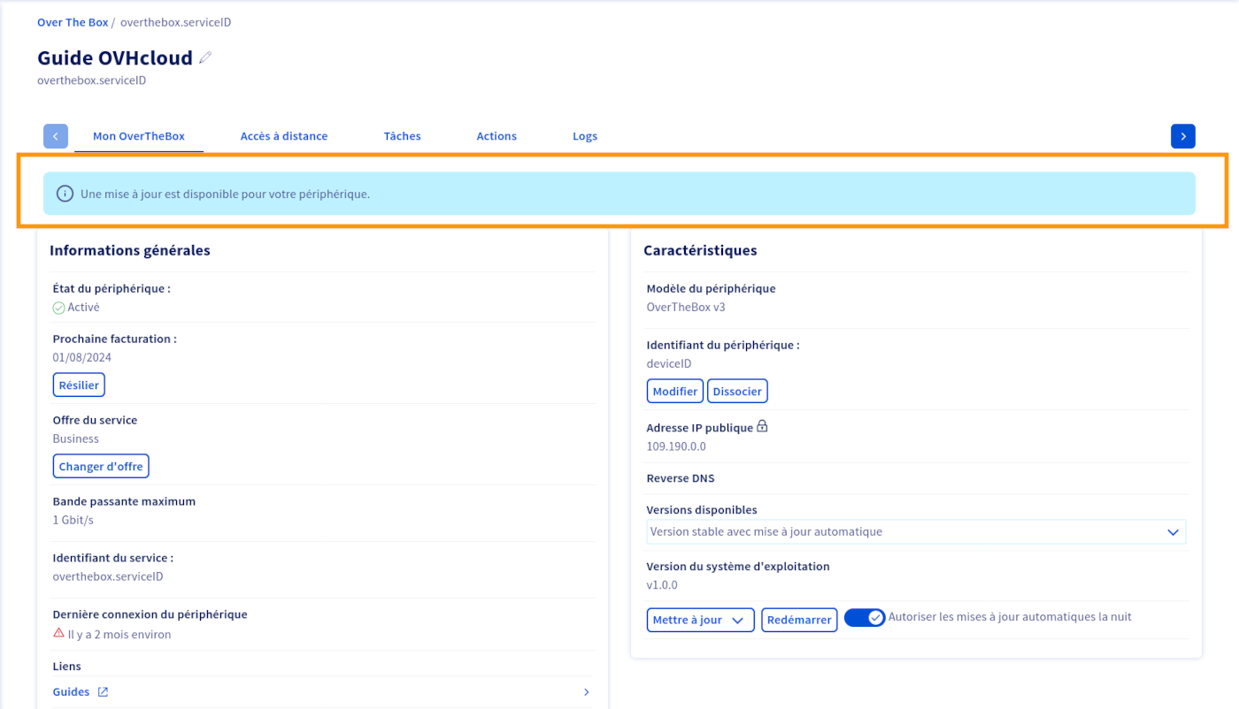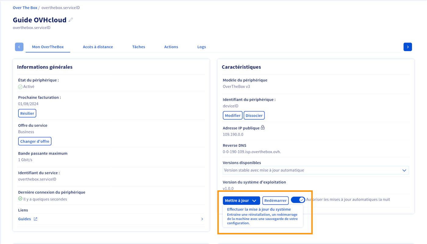 La méthode recommandée est de mettre à jour votre appareil OverTheBox depuis l'espace client OVHcloud.