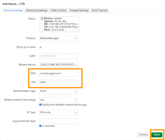 Dans le cas de l'OTB V3 LTE , vérifiez la configuration des APN ainsi que le PIN de la carte SIM.
