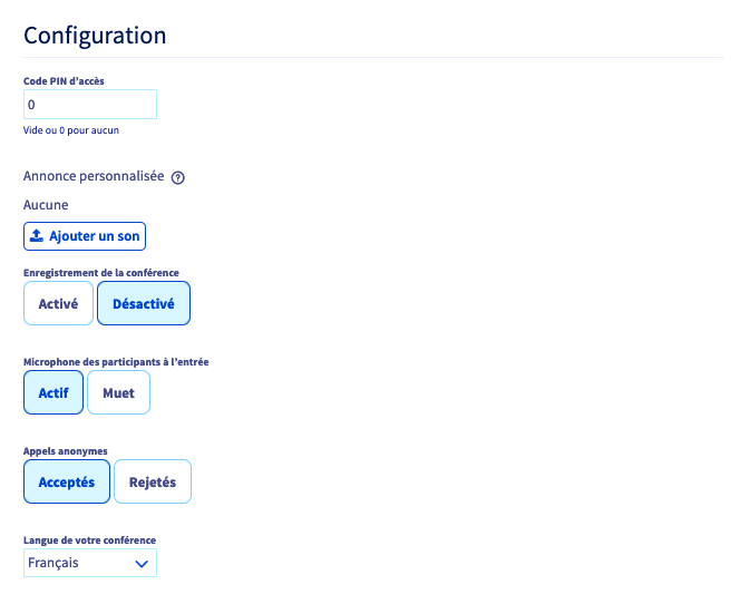 Le code PIN défini devra être renseigné lorsqu'un participant rejoindra la conférence. Celui-ci doit être compris entre 1 et 8 numéros. Indiquez « 0 » ou laissez la case vide pour ne pas utiliser de code PIN.