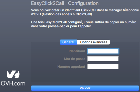 Installez EasyClick2Call sur votre machine et ouvrez-le. Vous serez alors invité à renseigner les informations suivantes.