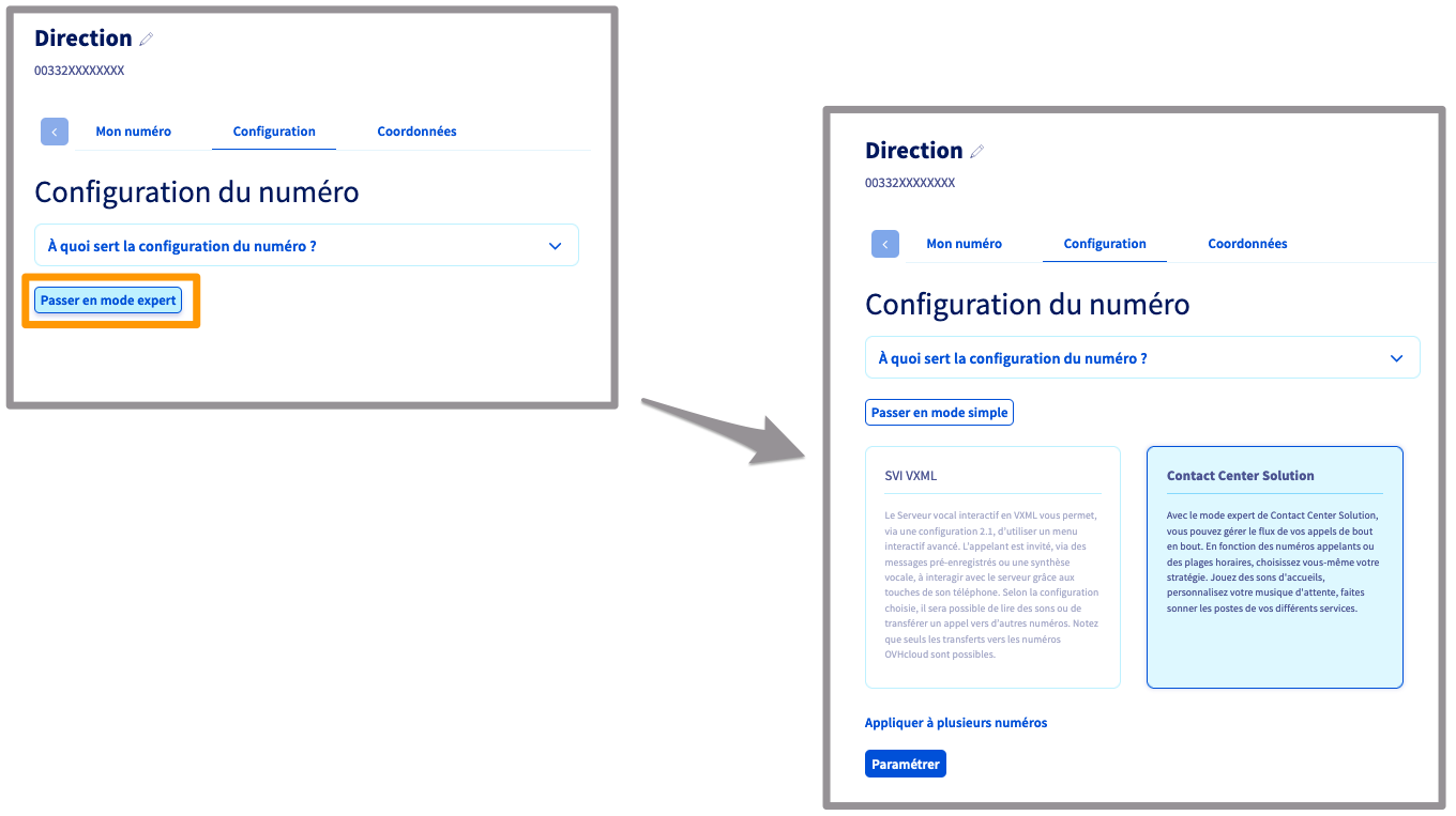 Configuration, cliquez surPasser en mode expertpour sélectionner Contact Center Solution. - Validez en cliquant sur