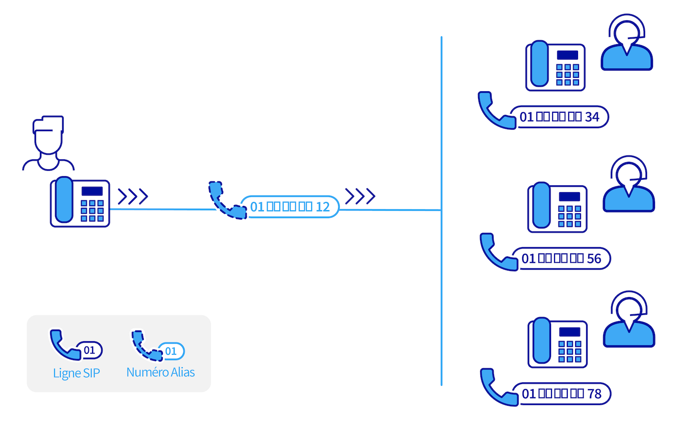 Dans une entreprise, le schéma classique est d'avoir, au minimum, un numéro alias principal, facile à mémoriser pour la clientèle, qui redirige les appels vers les lignes SIP directes des employés.