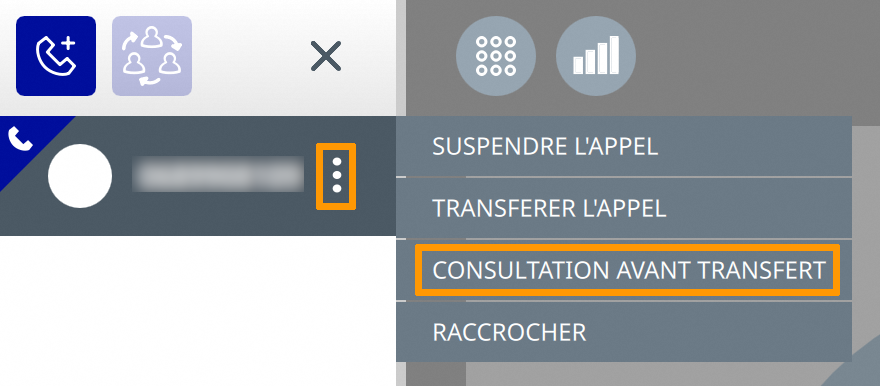 Juste à droite du numéro de votre correspondant en cours, cliquez sur les trois points (⋮). Dans le menu qui s'affiche, choisissez Consultation avant transfert.