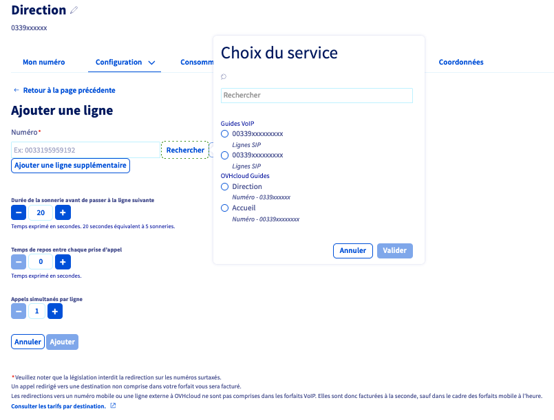 - Les redirections vers un numéro mobile ou une ligne externe à OVHcloud ne sont pas comprises dans les forfaits VoIP. Elles sont donc facturées à la seconde, sauf dans le cadre des forfaits mobile à l'heure.