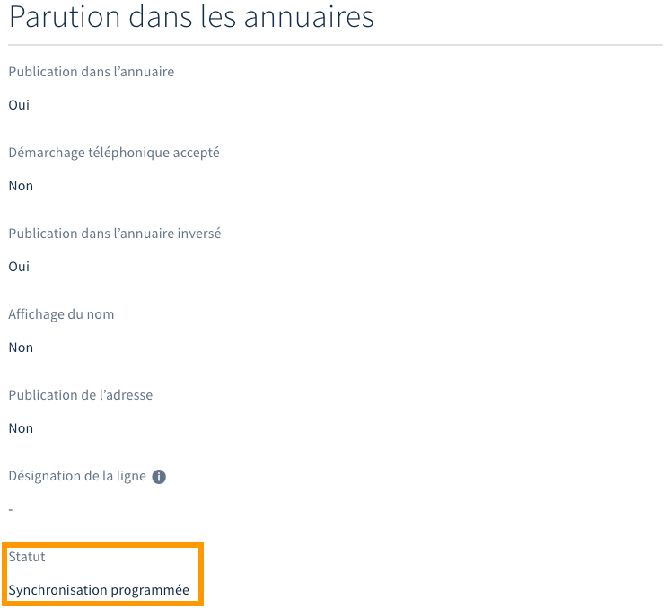 le statut indique « Synchronisé » : les informations renseignées dans votre espace client sont celles qui s'affichent dans les annuaires en ligne. La dernière modification est donc arrivée à son terme.