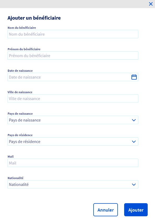 Dans le cas contraire, cliquez sur + Ajouter un bénéficiaire et renseignez les coordonnées du bénéficiaire.
