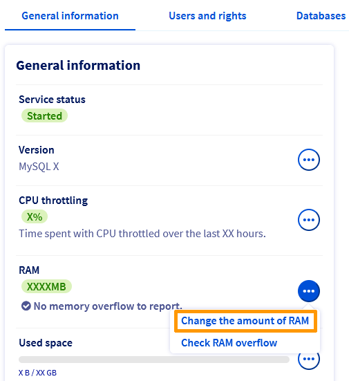 Nello Spazio Cliente OVHcloud, clicca su Database nella sezione Web Cloud Databases e seleziona l'istanza SQL. Assicurati di trovarti nella scheda Informazioni generali.