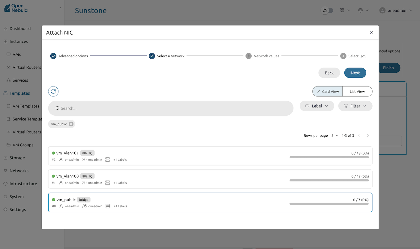 Finally, attach network adapters. In this example, we provide a public IP to this server, based on the public IP range we created during the OpenNebula automated deployment. Without any override, an available IP address from the public range will be picked for this interface.