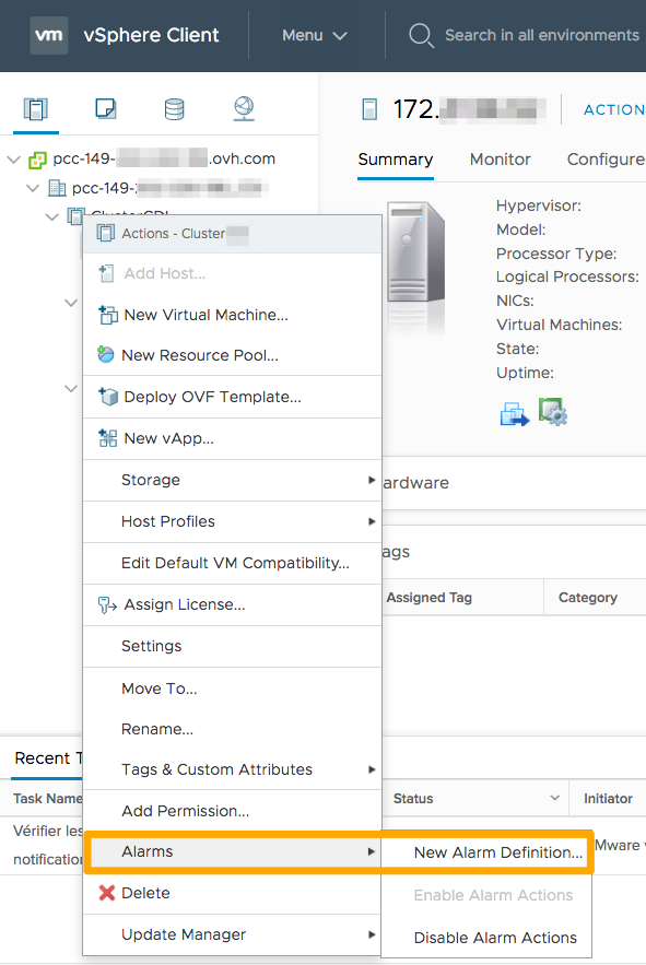 To create an alert, right-click on the datacentre or any other item you want to monitor, and then click on Alarms and New Alarm Definition.