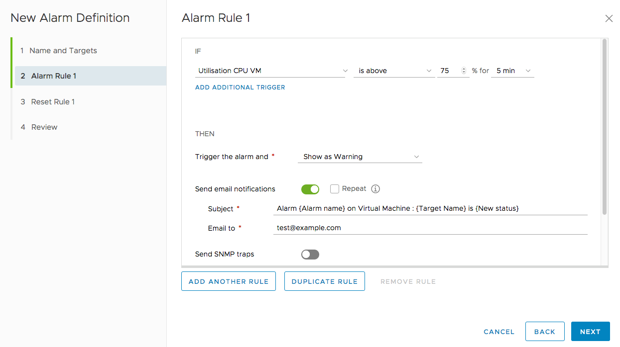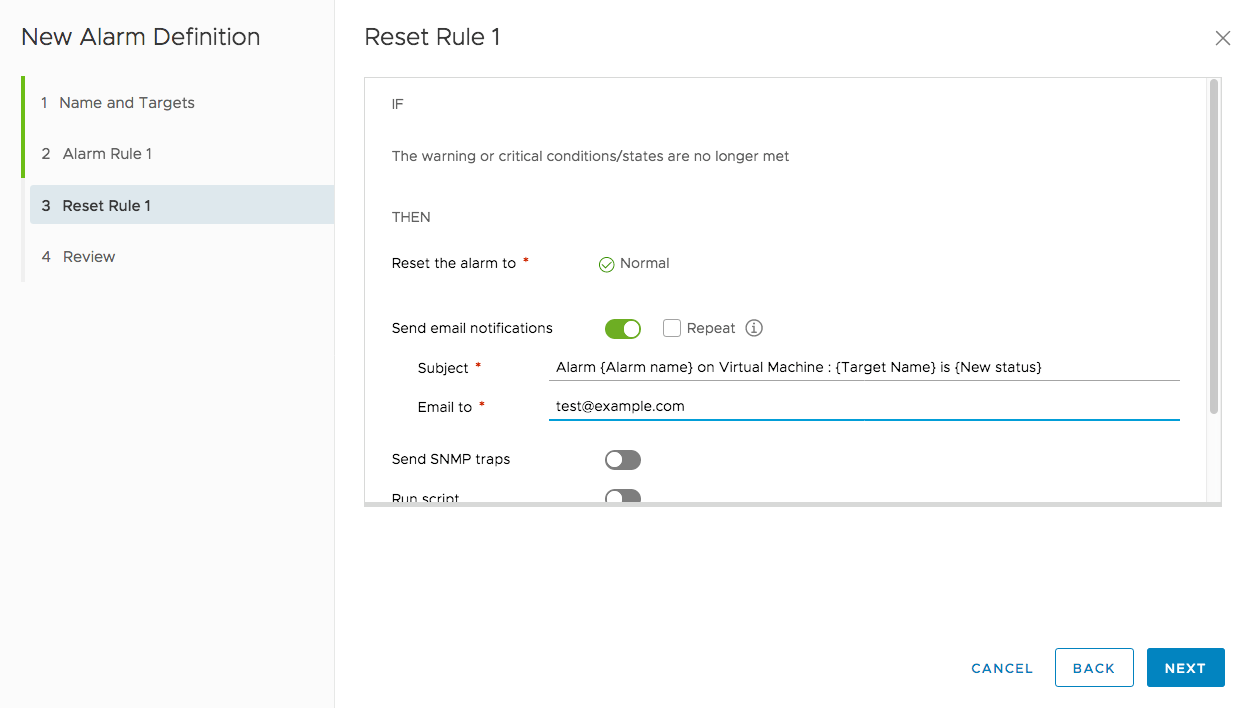 The THEN field allows you to indicate that the alert is triggered with a certain degree of criticality and will result in actions such as sending an email, executing a script or shutting down a VM.