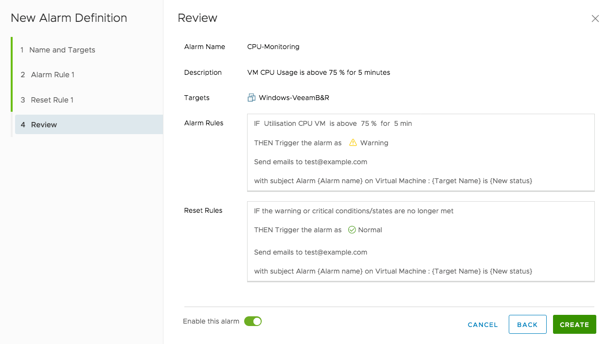The last step shows you a summary of the rules defined. You can activate the alarm by checking the cursor or choose to activate it later by right-clicking the selected item and then clicking Alarms and Enable Alarm Actions.