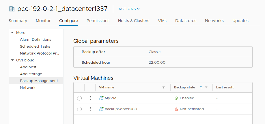 Select the VMware data centre, then the Configure tab and choose Backup Management from the OVHcloud section of the menu.