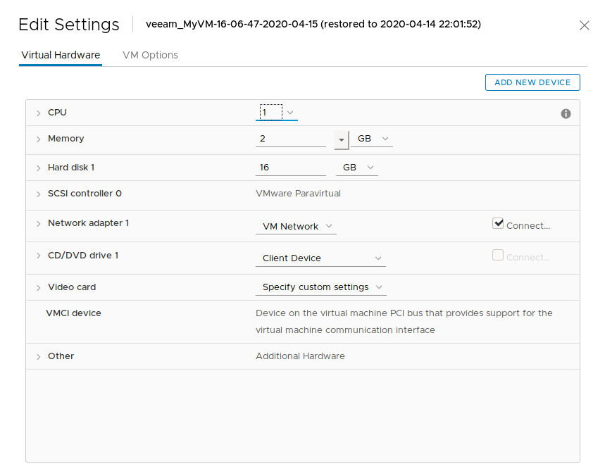 Note that the restored machine is connected to the network. If you start the VM without turning off the source VM, there may be an IP address conflict.