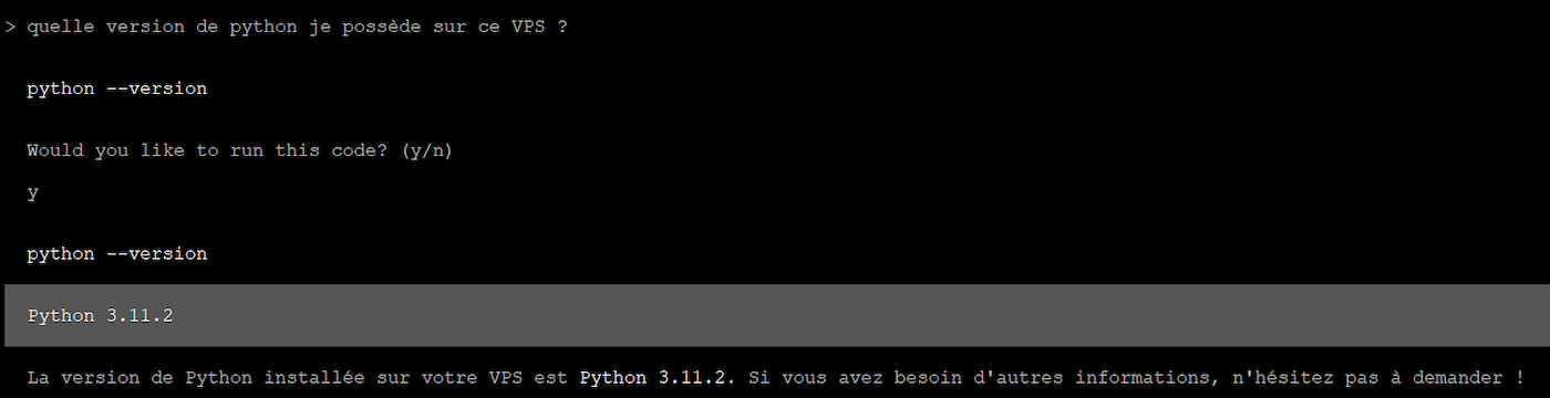 With this guide, you have installed an AI agent on your OVHcloud VPS, capable of executing commands from simple natural language instructions. Whether you have opted for a remote model like GPT-4 via OpenAI or a local model like Mistral via Ollama, you now have an intelligent assistant directly in your terminal, without dependency on a web interface or a third-party service.