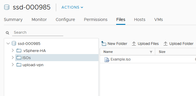 You can refer to the guide Upload an ISO to a datastore for more information on uploading elements (ISO, files, etc.) to your VMware on OVHcloud environment.