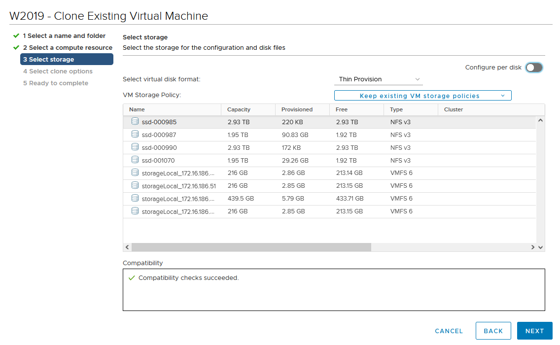 Select the clone VM storage location.
