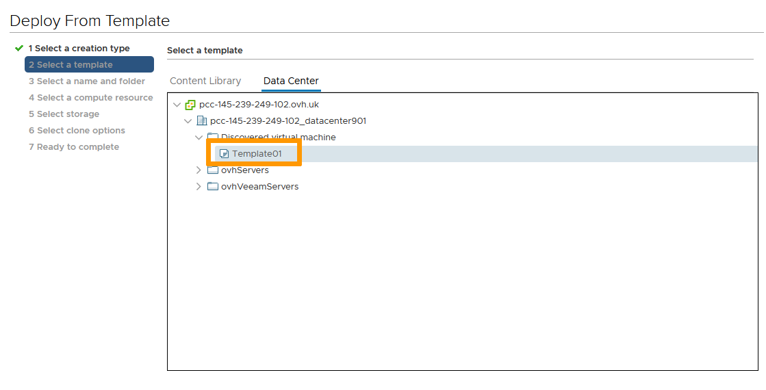 Name the template VM and select its datacenter location.