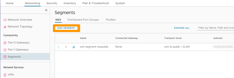 Through the NSX interface, click on the Networking tab and click on Segments on the left in the Connectivity section. Then click ADD SEGMENT.
