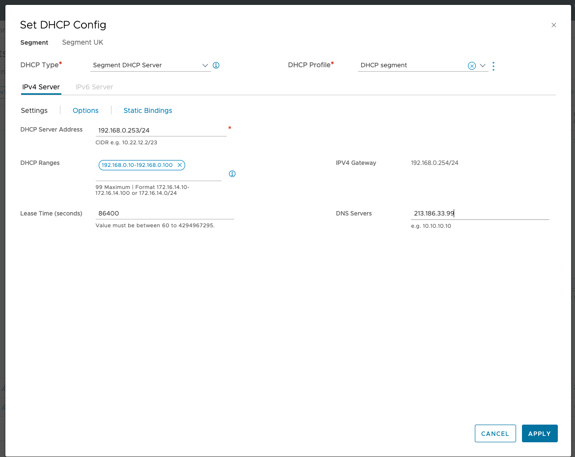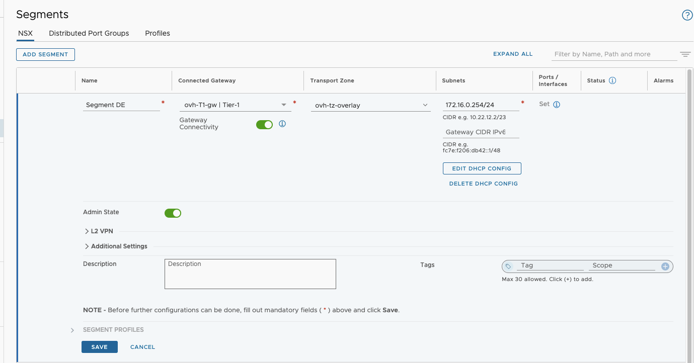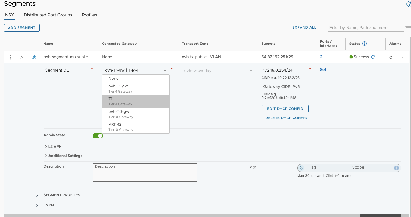 Create an overlay segment in the location where we plan to deploy our virtual machine. Use 172.16.0.254 (DE) or 192.168.0.254 (UK) as the gateway IP address on this segment. Optionally, configure a DHCP server to simplify deployment, although this is not required. Please note that we are currently connecting our segment to the ovh-T1-gw T1, but this configuration will be modified later.
