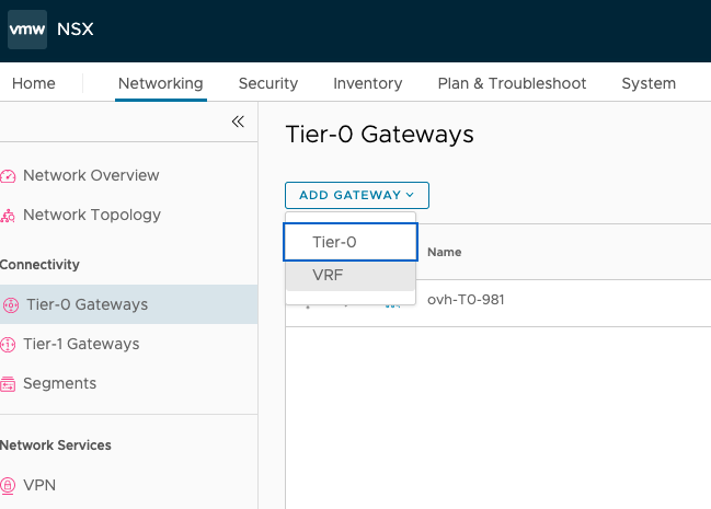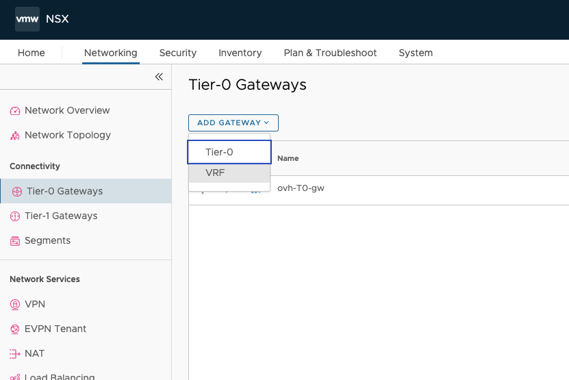 1. To create a Virtual Routing Firewall (VRF), go to Connectivity > Tier-0 Gateways > Add Gateway > VRF.