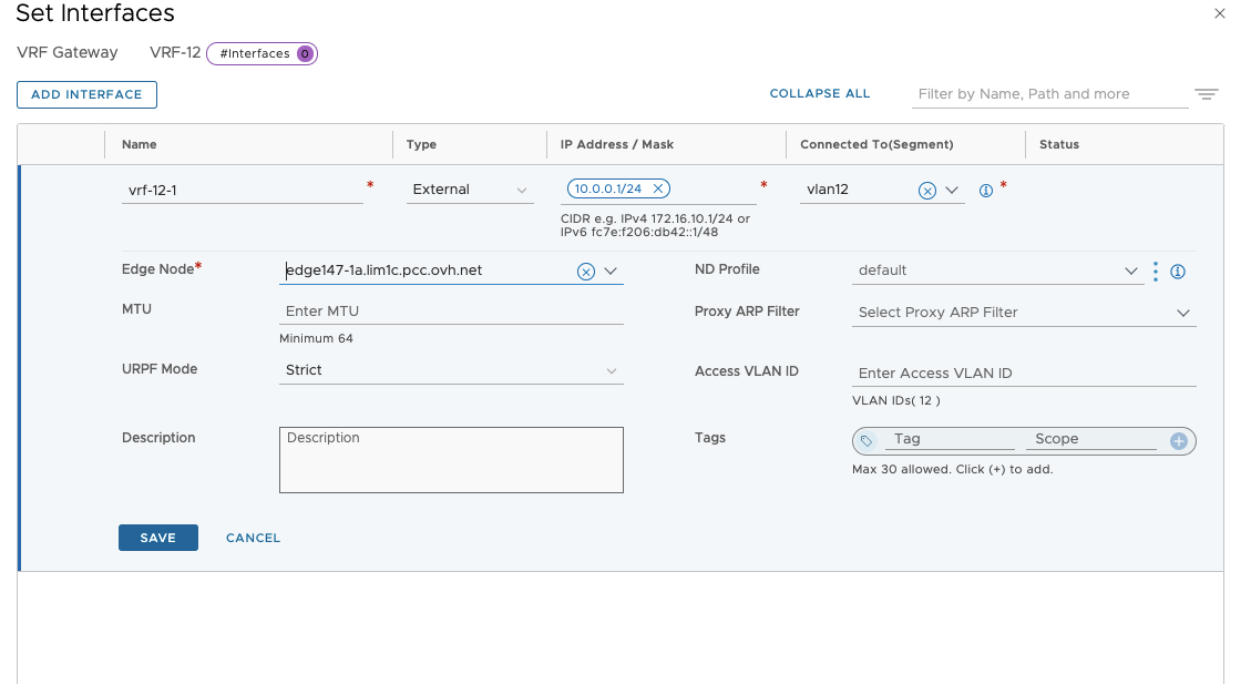 3. Configure two interfaces, one for each edge. Choose two free addresses from your VLAN IP range (for example, we will take 10.0.0.1/.2/.3/.4), then connect them to the VLAN12 segment you have created.