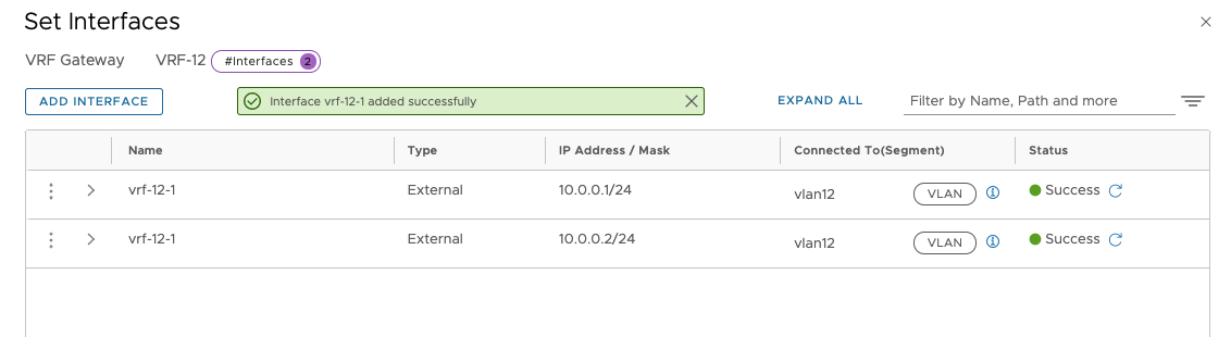 4. Verify that your two interfaces are created and that their status is in Success (section Tier-0 Gateway).