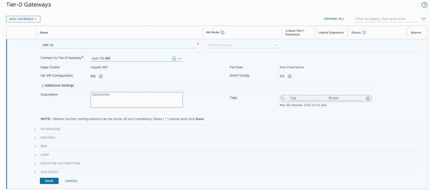 In the Tier-1 Gateways > Add Tier-1 Gateway section, create a new T1 gateway. Choose a name that suits your needs, then connect it to the VRF you have created and finally, connect it to your Edge cluster.