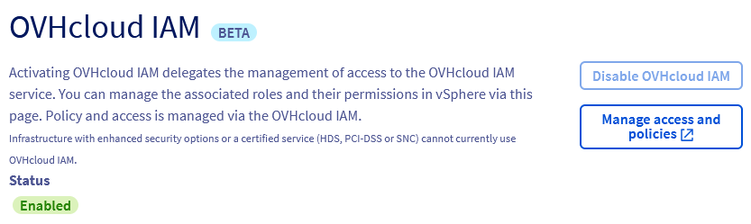 OVHcloud IAM is not available on environments with advanced security and certification options (PCI-DSS, HDS, HIPAA, SNC).