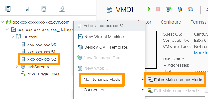 Po lewej stronie ekranu kliknij prawym przyciskiem myszy na hosta. W sekcji Maintenance Mode wybierz Enter Maintenance Mode.