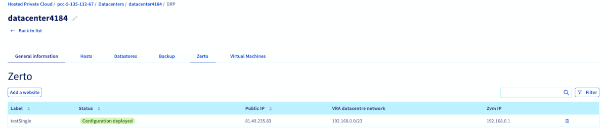 ZVM Private IP (Managed vSphere): The private IP addresses of Zerto VMs (ZVM and vRAs) hosted in Managed vSphere.