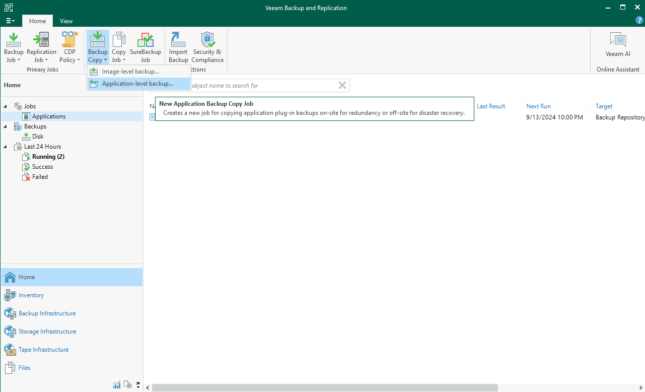 Ouvrez la console Veeam Backup and Replication, sélectionnez le menu Home, Backup Copy, puis Application-level backup....